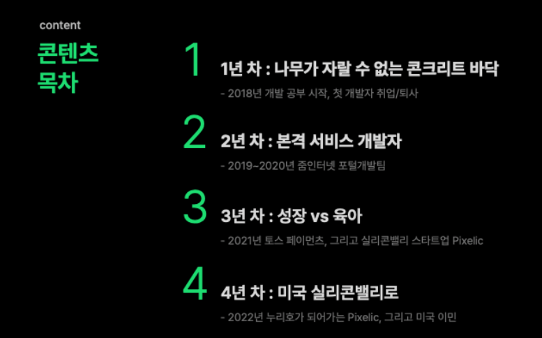 개발자가 되려는 비전공자분들, 1~2년 차 주니어 개발자분들보다 한 발짝 앞서 걸어간 입장에서, 발표를 들으시는 분들이 앞으로 하실 수많은 선택에 있어 제 경험을 참고하실 수 있도록 지금까지 제가 했던 선택을 소개하고 스스로 평가합니다. 저의 선택과 경험은 정답이 아니므로 하나의 개발자 커리어 케이스로만 봐주시면 감사하겠습니다.