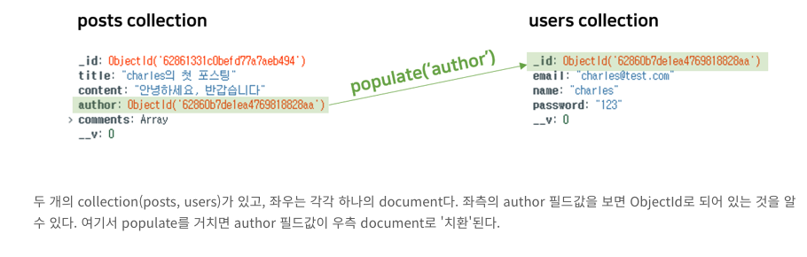 Populate는 문서의 경로를 다른 컬렉션의 실제 문서로 자동으로 바꾸는 방법입니다.