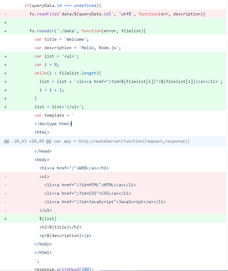 20강 반복문 console.log('A'); console.log('B'); var i = 0; while(i < 2){ console.log('C1'); console.log('C2'); i = i + 1; } console.log('D'); 21강 배열 var arr = ['A','B','C','D']; console.log(arr[1]); console.log(arr[3]); arr[2] = 3; console.log(arr); console.log(arr.length); arr.push('E'); console.log(arr); 22강 배열과 반복문 var number = [1,400,12,34]; var i = 0; var total = 0; while(i < number.length){ to..